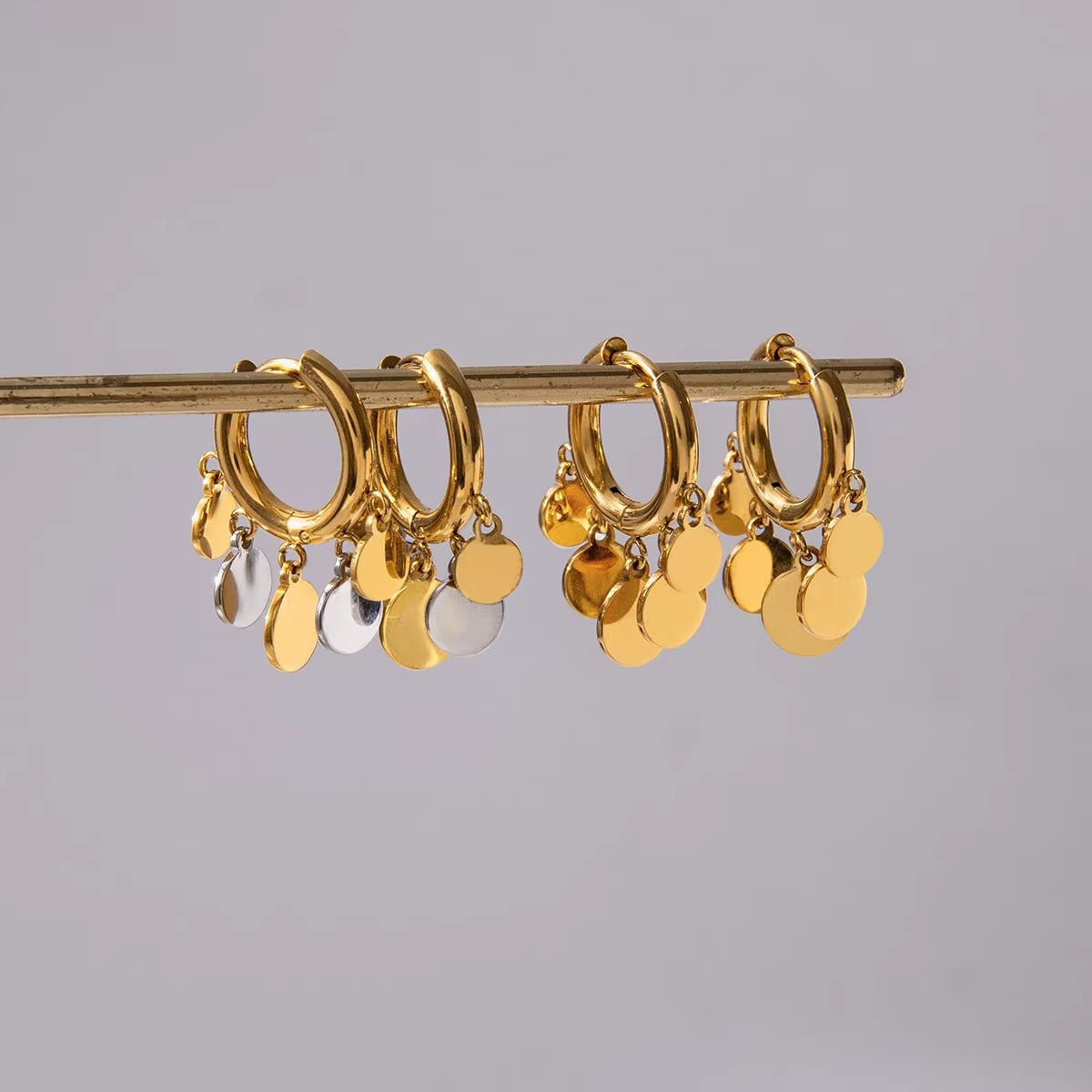 Gold hoops with dangling coin charms in alternating gold and silver.