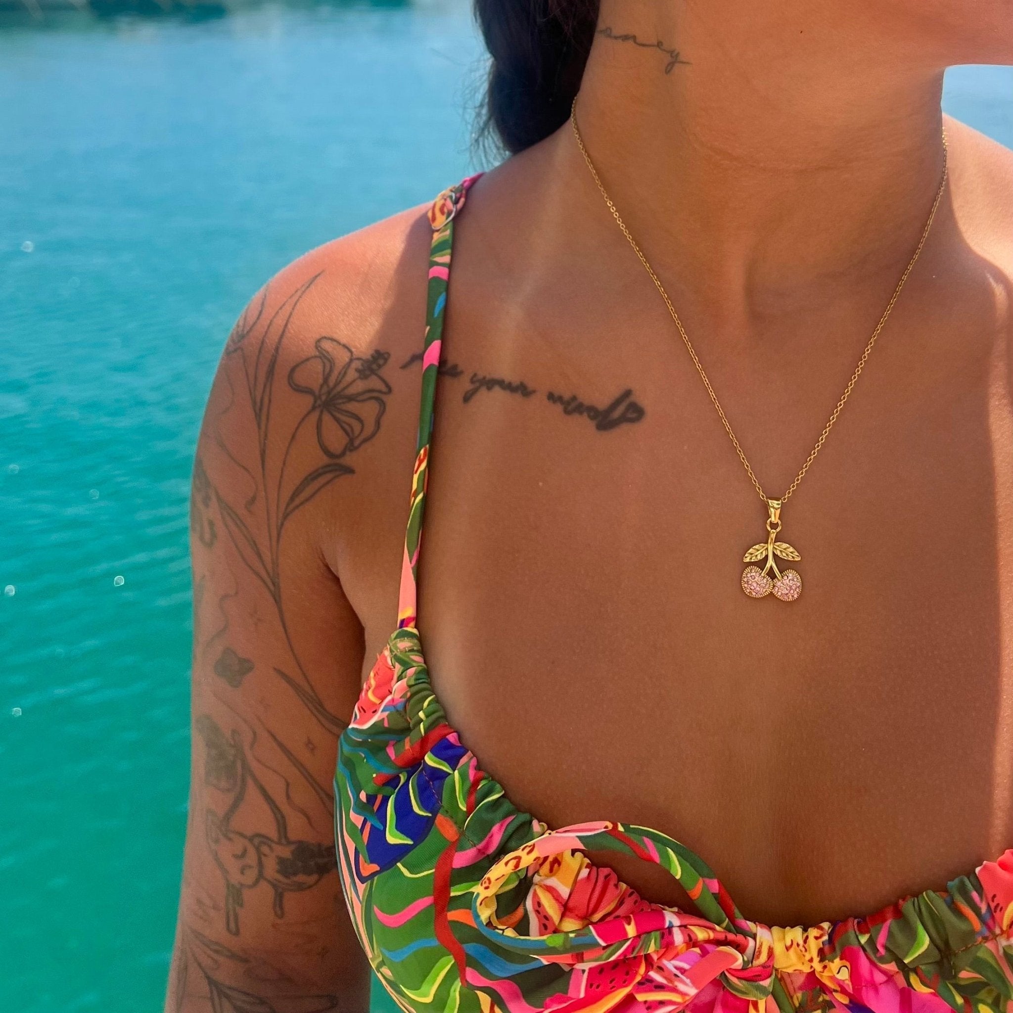 This Pink CZ Cherry Necklace is a fun but minimal piece; with subtle pink gemstones in a gold cherry, this is the perfect girly necklace 🍒